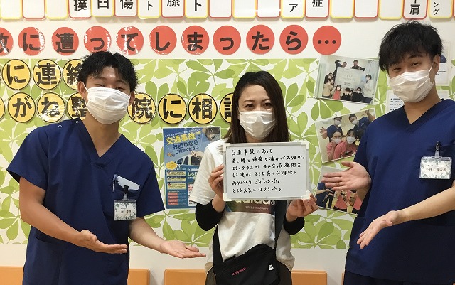 交通事故に遭って、首と腰と頭痛の痛みがありました。 スタッフの方が体に合った施術をして頂いて、とても良くなりました。 ありがとうございました。 とても元気になりました。
